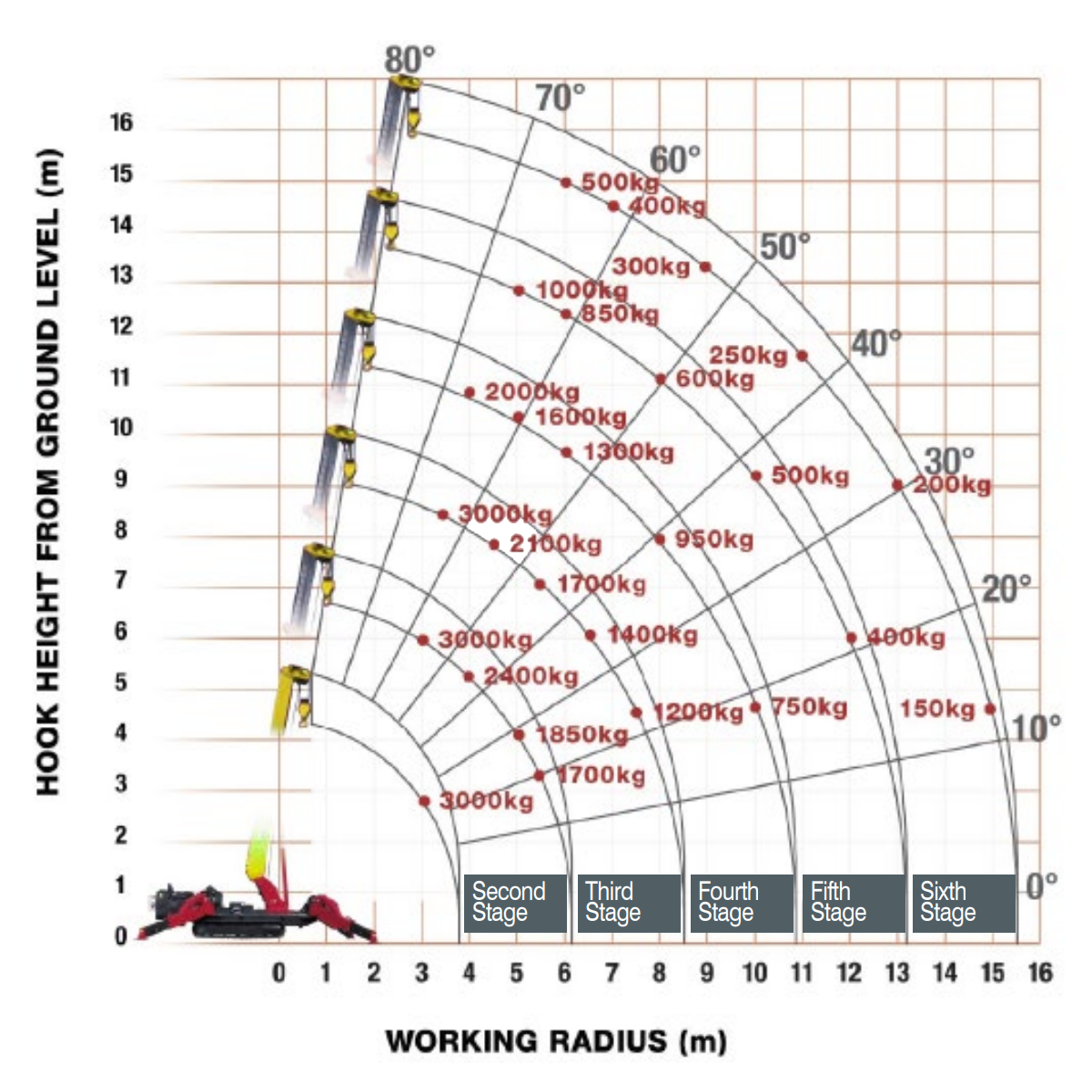 The mini yet mighty UNIC URW-506 spider crane is capable of lifting loads of up to 3.0 tonnes and boasts from a lifting height of up to 16 metres. It features a six section hydraulic boom to allow a maximum working radius of 15.52m.